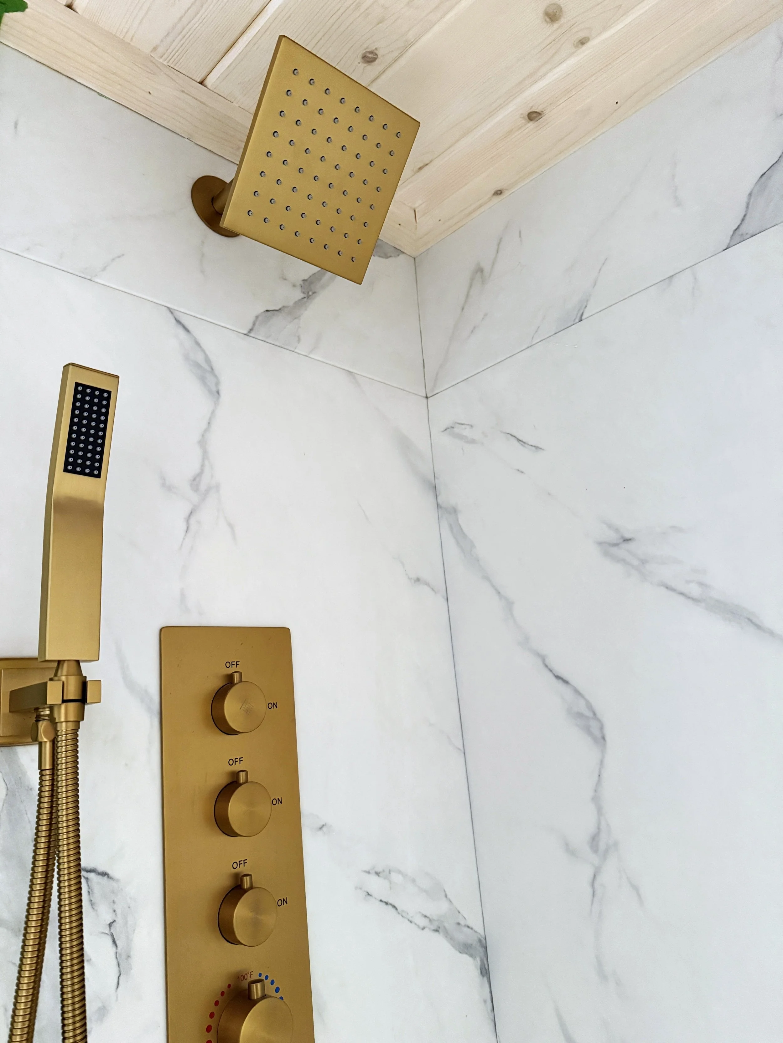 Luxury Bathroom with Waterfall Shower System and Freestanding Soaking Tub